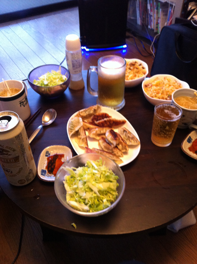 ギョーザ以外にもコップまで冷やされたビール、手作りチャーハンとスープ、ホタテとソーセージの何か。